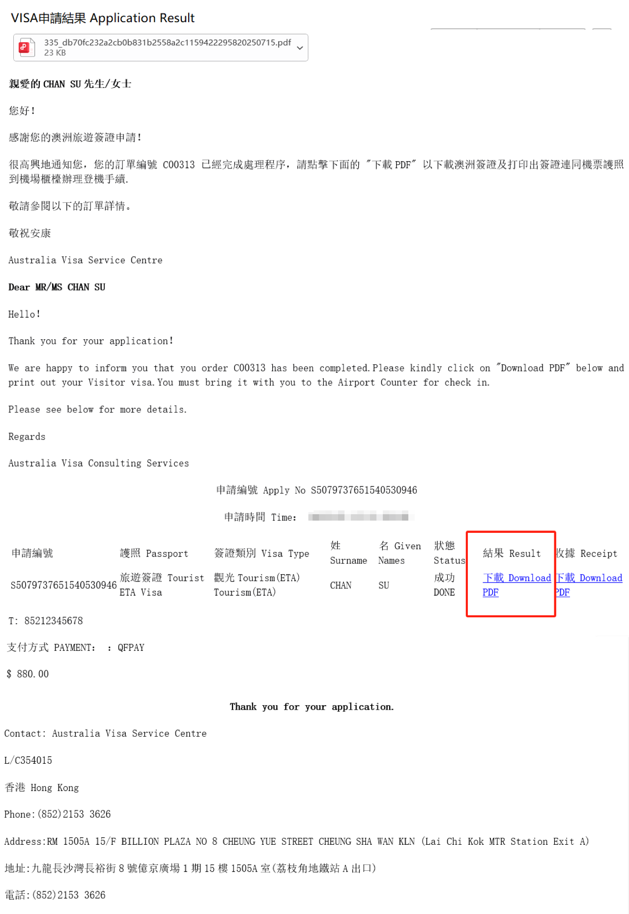VISA申請結果
