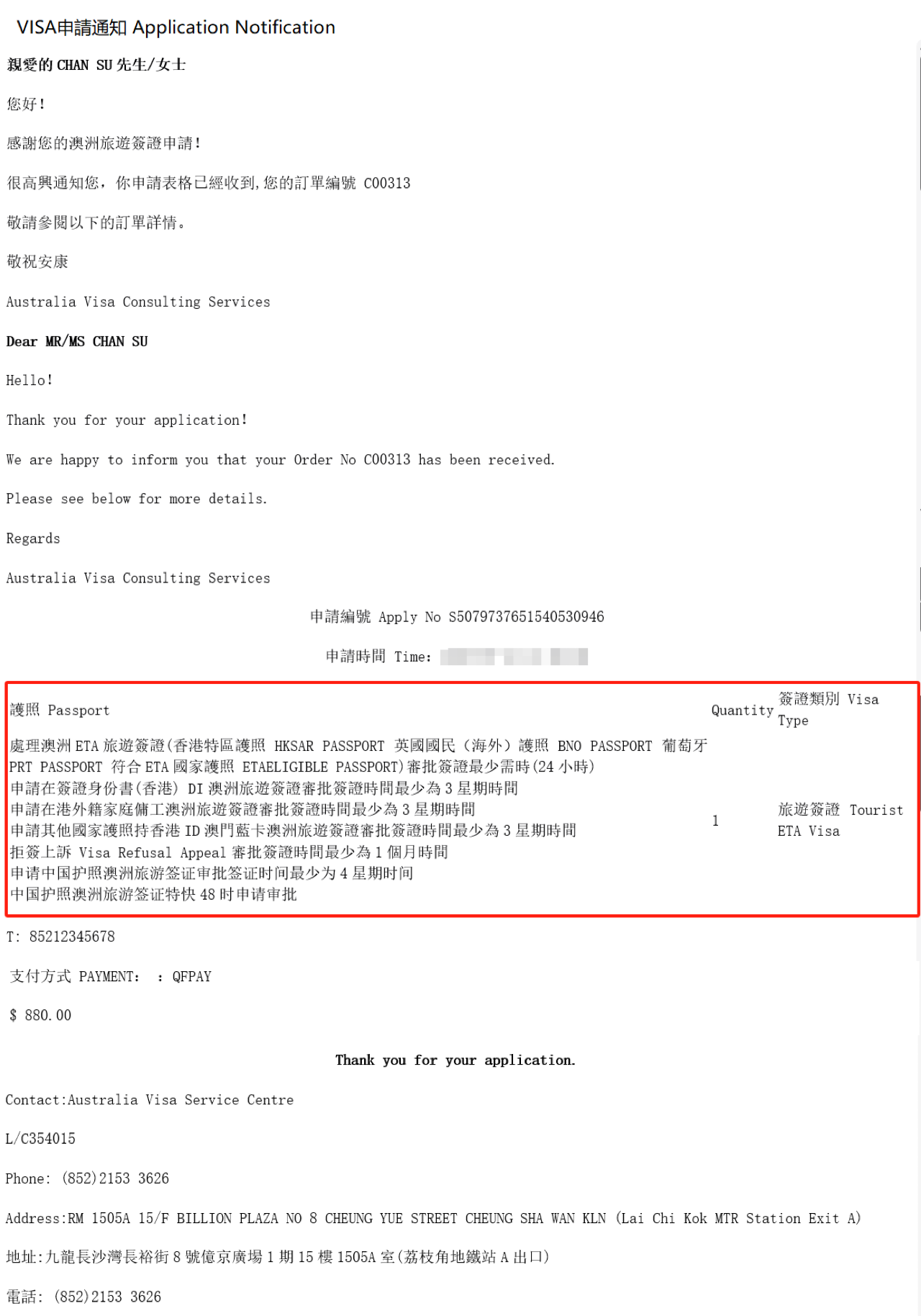 VISA申請通知